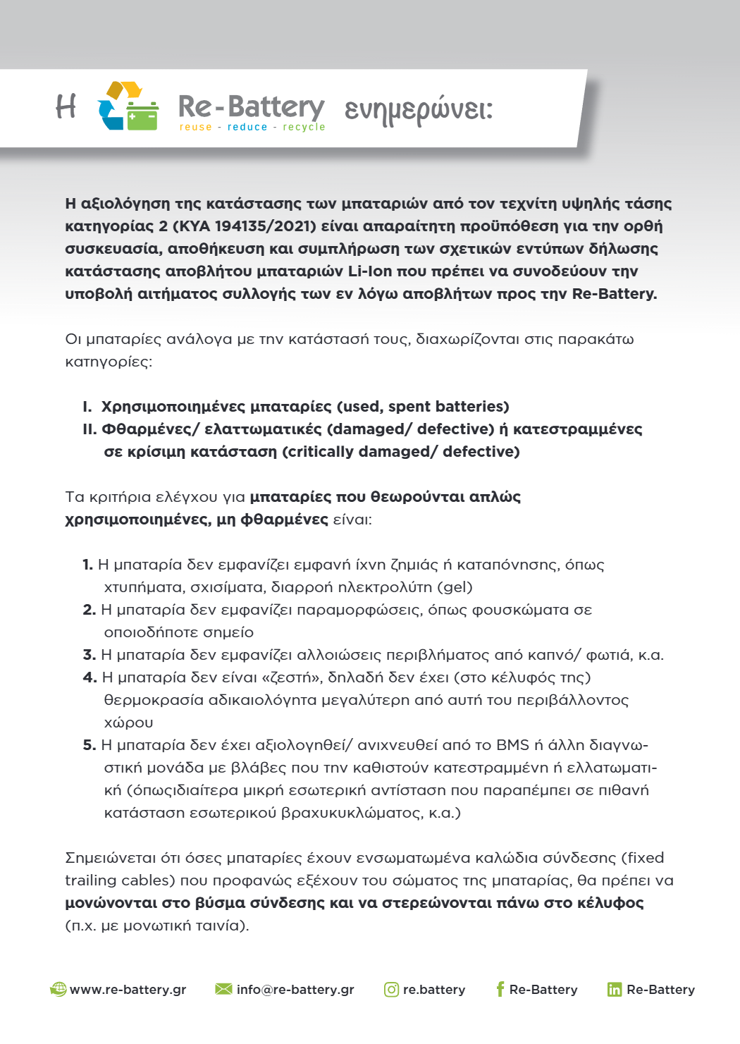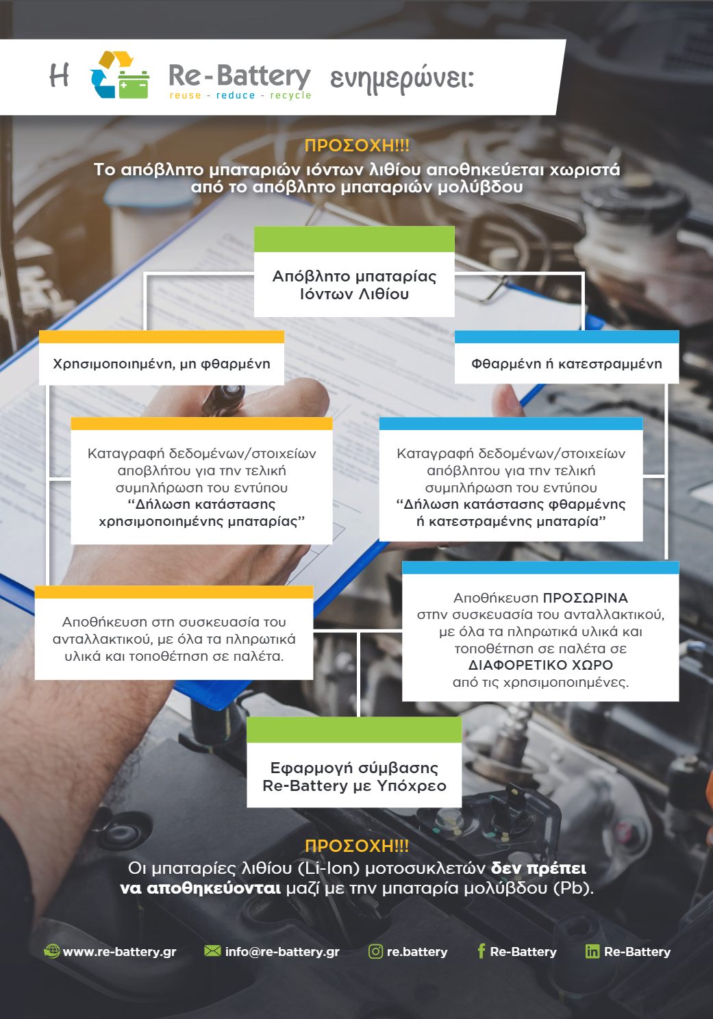 Με την παροχή αξιόπιστης και τεχνικά έγκυρης πληροφόρησης, η Re-Battery στηρίζει συνεργεία, τεχνικούς και επιχειρήσεις του κλάδου στην υιοθέτηση υπεύθυνων πρακτικών διαχείρισης αποβλήτων συσσωρευτών.