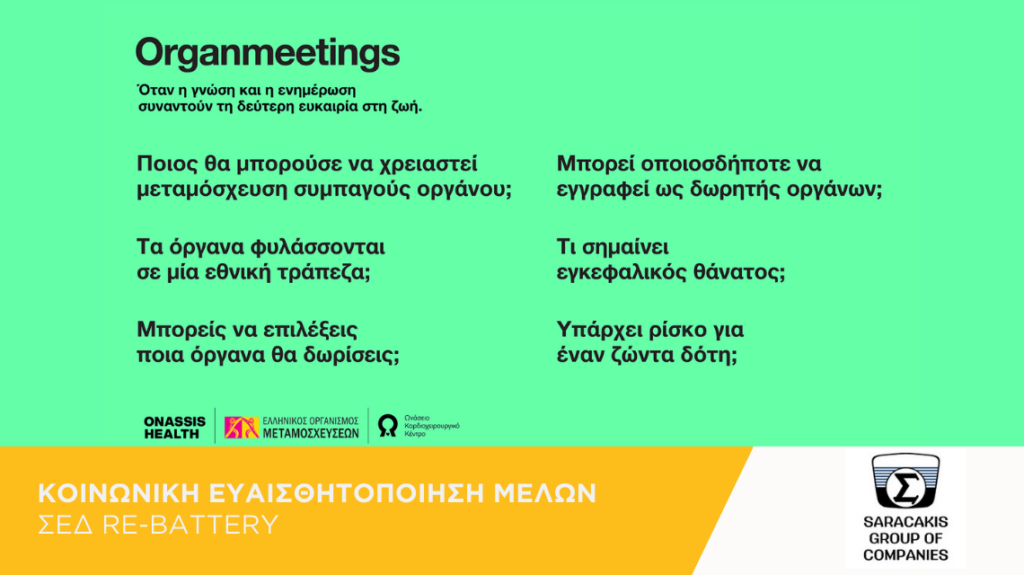 Ο Όμιλος Επιχειρήσεων Σαρακάκη στο πλαίσιο των δράσεων Εταιρικής Κοινωνικής Ευθύνης και με τη δέσμευση να είναι ωφέλιμος και να προσφέρει στο σύνολο της κοινωνίας, συμμετέχει ενεργά στη μεγάλη εκστρατεία ενημέρωσης για τη δωρεά οργάνων και τις μεταμοσχεύσεις.