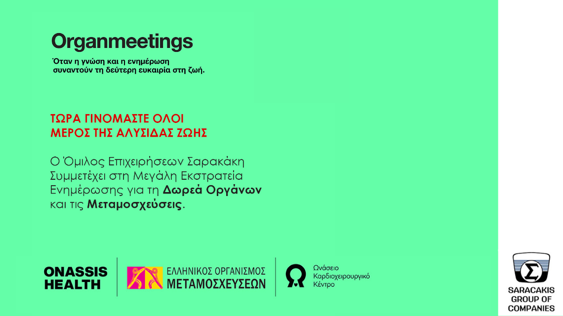 Ο Όμιλος Επιχειρήσεων Σαρακάκη στο πλαίσιο των δράσεων Εταιρικής Κοινωνικής Ευθύνης και με τη δέσμευση να είναι ωφέλιμος και να προσφέρει στο σύνολο της κοινωνίας, συμμετέχει ενεργά στη μεγάλη εκστρατεία ενημέρωσης για τη δωρεά οργάνων και τις μεταμοσχεύσεις.
