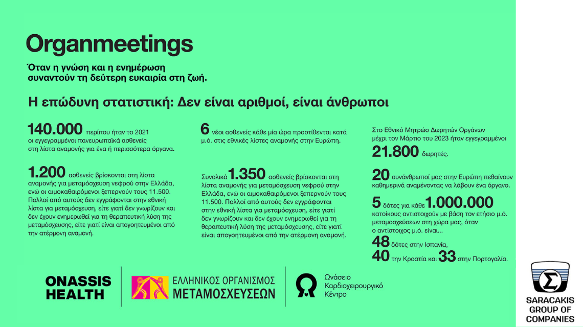 Περισσότερες πληροφορίες για το πρόγραμμα Organmeetings και τη δωρεά και μεταμόσχευση οργάνων: https://www.onassis.org/el/health/organmeetings