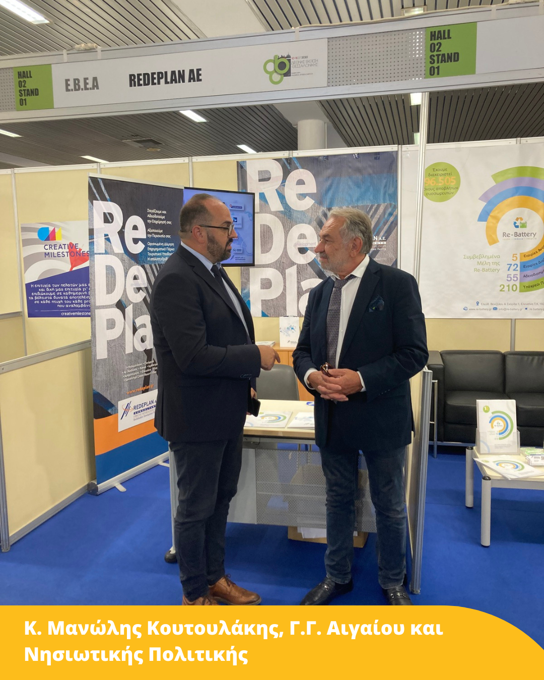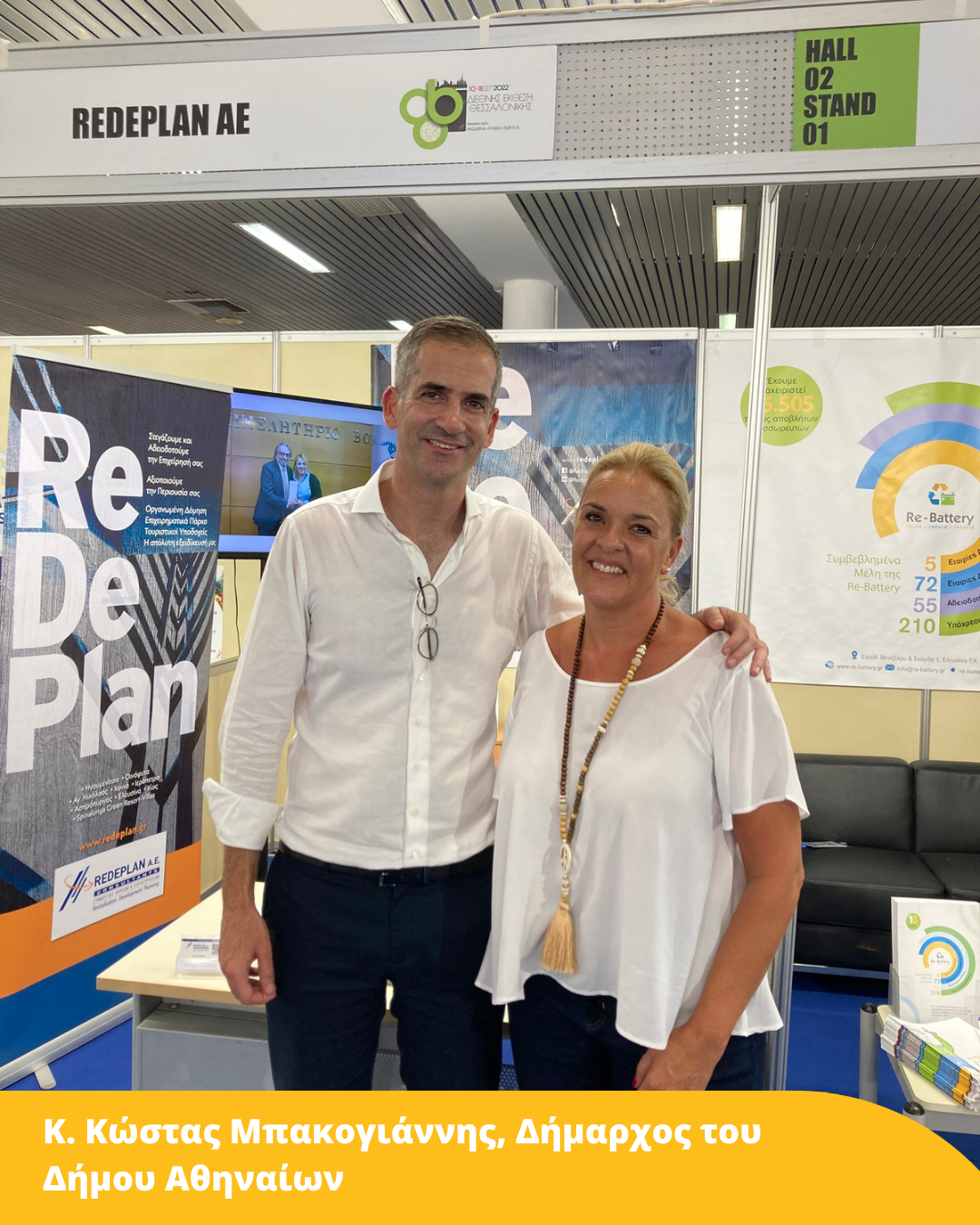 Ενώ την εταιρική μας παρουσίαση εκπροσώπησαν: ο κ. Μανώλης Μπαλτάς Διευθύνων Σύμβουλος Re.De – Plan A.E., η κα Σοφία Χούμα Ειδικός Σύμβουλος Συστημάτων Εναλλακτικής Διαχείρισης Re.De – Plan A.E., καθώς και η Γενική Διευθύντρια της Re-Battery A.E. κα Ματίνα Ζιώγου.