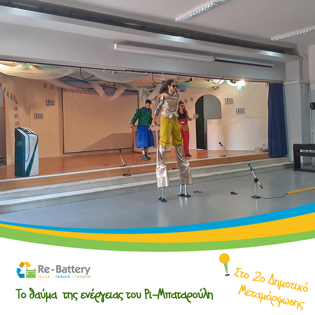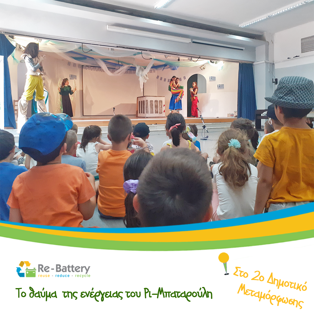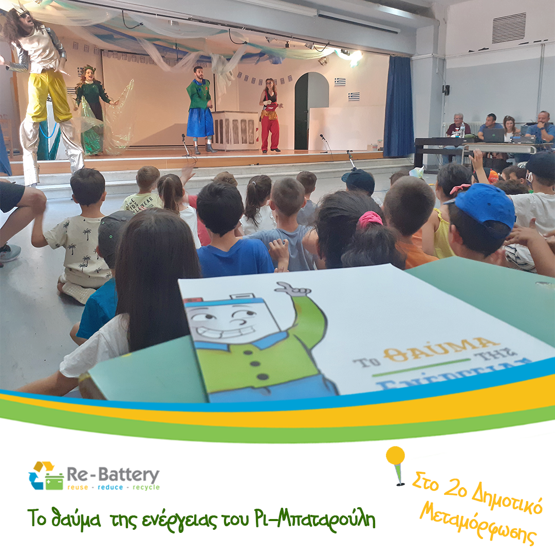 H θεατρική παράσταση «Το θαύμα της ενέργειας με τον Ρι-Μπαταρούλη», του Ιωάννη Έντγκαρ Αβετικιάν, πραγματοποιήθηκε με τη χορηγία της Re-Battery στο Αθλητικό κέντρο Γκράβας-Αττικής.